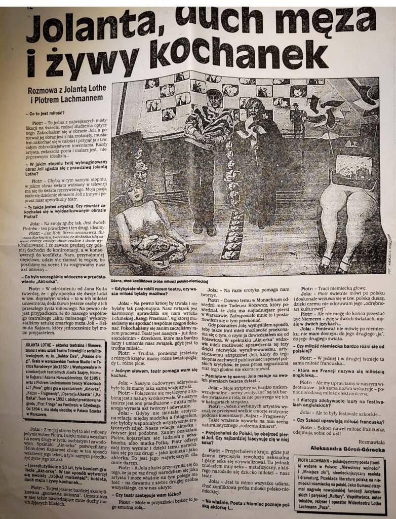 Niedowierzanie polskiej krytyki towarzyszyło i kolejnym spektaklom, w których Jolanta Lothe wcielała się w coraz to nowe postacie spektaklu „akt-orka”, opartego głównie na słowach z legendarnej sztuki Kajzara. p.t. „Gwiazda”. Legendarnej, bo spektakl w reżyserii Zdzisława Wardejna w r.1973 w Starej Prochowni zgromadził w na jednej scenie ówczesne gwiazdy polskiej sceny, m.i. Ninę Andrycz, Maję Komorowska, Zofię Rysiówną lub Wandę Stanisławską- Lothe, matkę Jolanty Lothe. Może ona uchodzić niejako za akuszerką naszego teatru. To ona wpadła na pomysł, żebym to ja po śmierci Helmuta Kajzara w r.1982 zaopiekował się jego artystycznym dziedzictwem. Byłem do tej pory tłumaczem jego sztuk na niemiecki i bliskim przyjacielem. Jego żona Jolanta Lothe wydawało mi się wtedy być dość zwyczajną aktorką , nie wartą szczególnej uwagi, jeśli abstrahuje się od jej znanych mi tylko ze słyszenia kreacji w inscenizacjach Kajzara w Teatrze Narodowym. Nie sposób było jednak nie widzieć jej niezwykłej urody  no i rzucających się ku jej własnemu utrapieniu w oczy „dorodnych” piersi, które ją określały, a o których Tadeusz Różewicz na ucho mi powiedział , że są najpiękniejszymi w całej Warszawie. Podkreślam ten “wątek”, będzie on bowiem znaczący w naszej pracy teatralnej, w której Jolanta Lothe niejako demonstracyjnie zrzuca ten ciężar na swój zaskakujący, wysoce artystyczny sposób. Nawzajem inspirowaliśmy się na bazie naszych dotychczasowych doświadczeń, szukając wciąż nowych ścieżek.